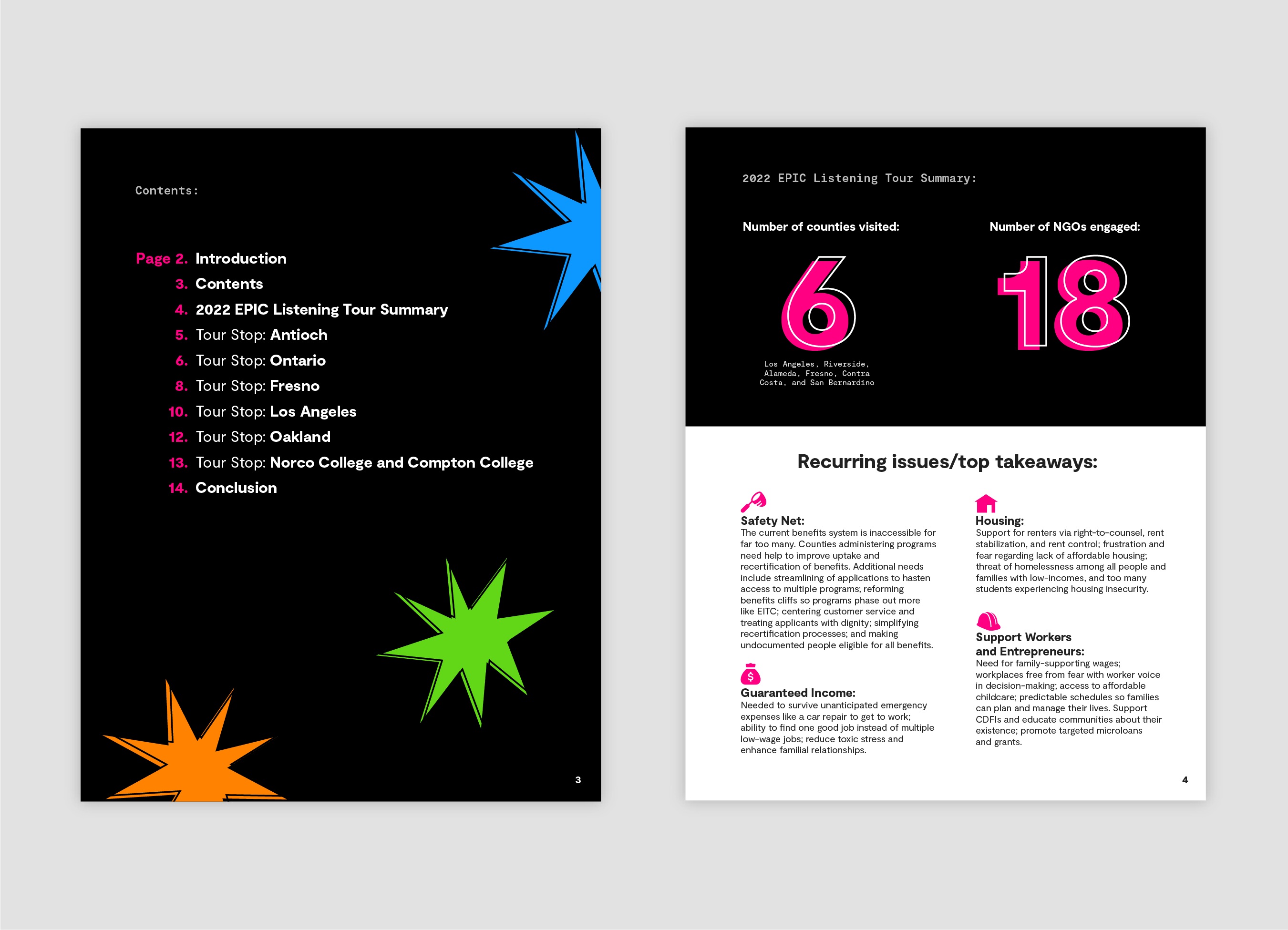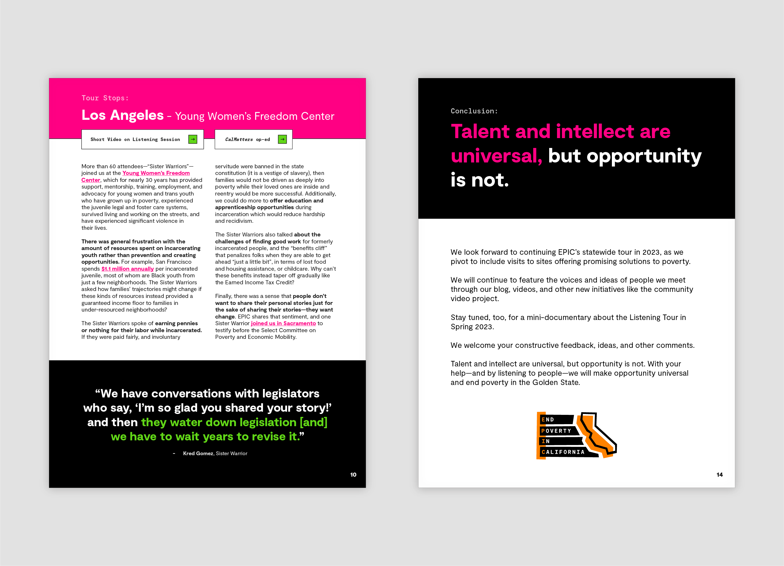 Nonprofit orgnaization EPIC - End Poverty in California had been engaged in a listening tour of the state and documented their learnings. I designed and created an interactive PDF with links to news articles, videos, and websites to be delivered to California Governor Gavin Newsom.